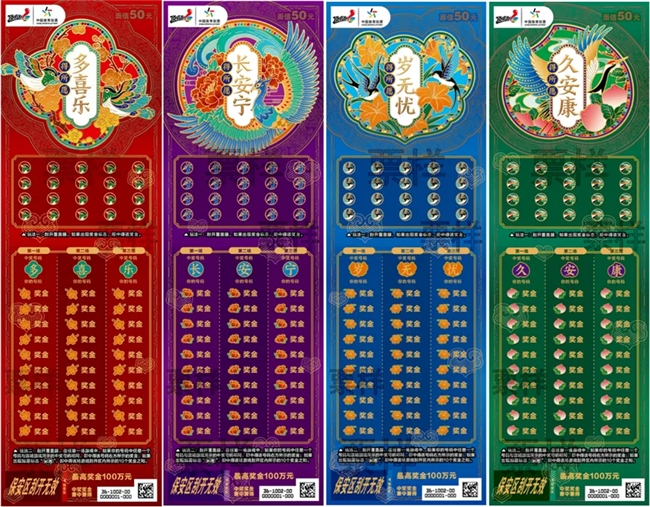 这款承载人们对美好生活向往与追求的体彩顶呱刮即开票,名称来自“多喜乐、长安宁、岁无忧、久安康”等传统中式祝福语,并巧妙融合喜鹊梅花、鸾鸟牡丹、燕子萱草花、仙鹤寿桃等经典祥瑞元素。除了富有诗意与时代特征的创意巧思,它还将个人愿望与社会公益相结合——每买一张彩票均能贡献彩票公益金,购彩者每一次购买“得所愿”,都是在为国家公益事业贡献自己的力量,将每个人的小心愿汇聚在一起,通过公益事业让更多人的心有所盼,变为得偿所愿。