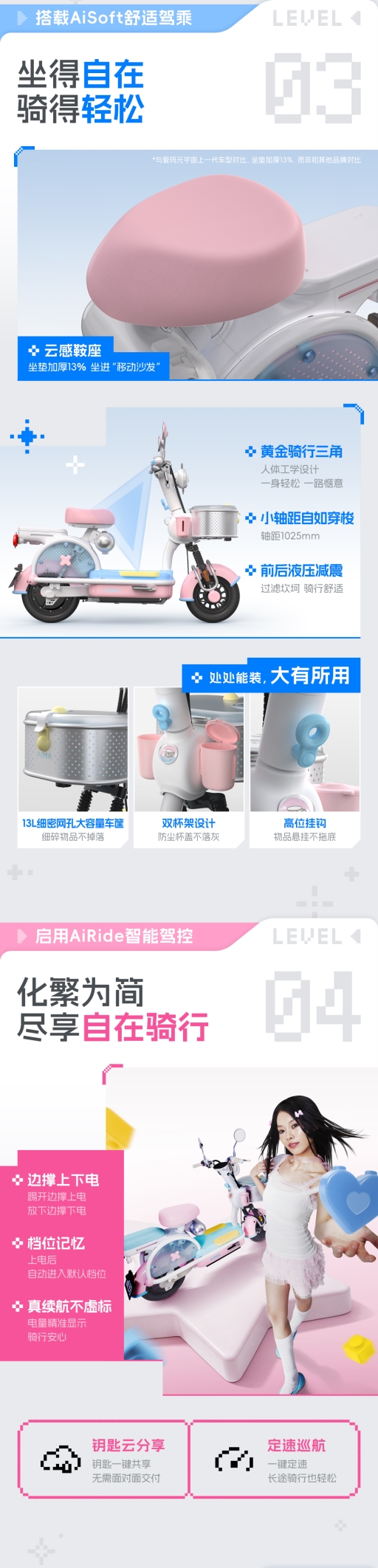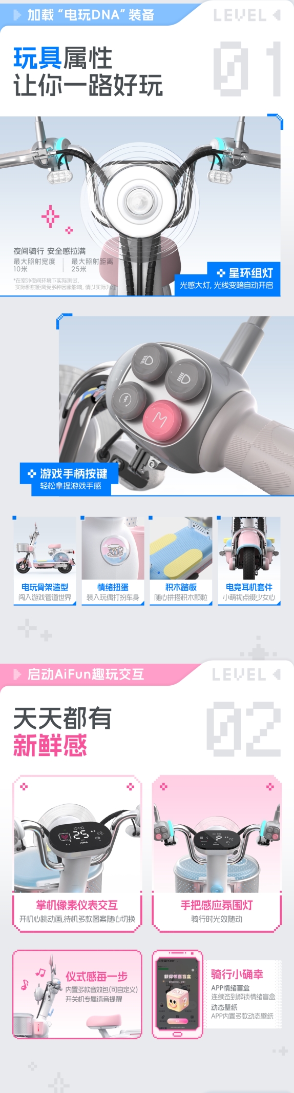 车身选用异星荧草绿、樱花柔粉、星尘黄、宇航员紫等潘通流行色,三喷三烤高端烤漆质感细腻,阳光下发亮,适配碎花裙、休闲卫衣、工装裤等各类穿搭,OOTD氛围感直接拉满。情绪扭蛋舱可放潮玩手办,积木踏板能自由拼搭,手把感应氛围灯随骑行状态变换,每处细节都戳中少女心,让你在人群中格外亮眼。