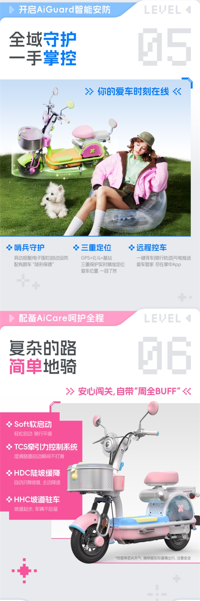 女孩独自或与闺蜜出行,安全感至关重要。爱玛元宇宙PONY软萌外表下藏着满级安全实力,400W新国标电机动力充足,Soft软启动设计让起步平稳不窜动,新手骑行也从容。标配TCS牵引力控制系统,雨雪天起步不打滑;HDC陡坡缓降,下地库自动控速;HHC坡道驻车,半坡起步不后溜,高端电摩的“保命三件套”,全方位守护骑行安全。